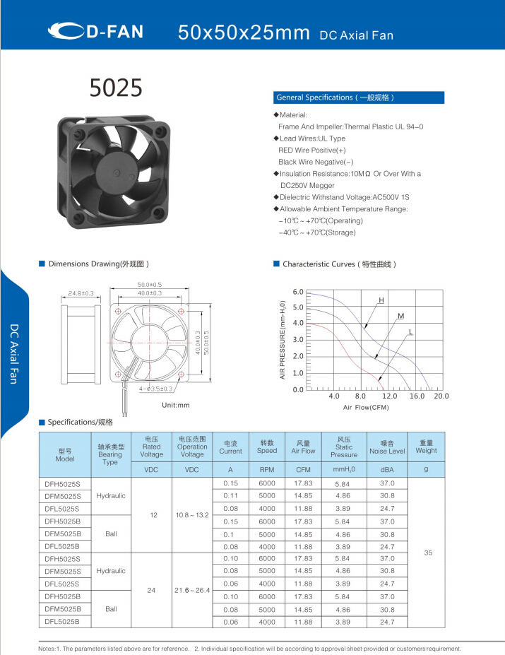 材料: 框架和叶轮:热塑UL 94-0 引线.UL类型 红色导线正极(+) 黑线负极(-) 绝缘电阻:10MΩ或以上,带DC250V高阻表 介电耐压:AC500V 1S 允许环境温度范围: -10℃-+70℃(运行) -40℃-+70℃(储存)